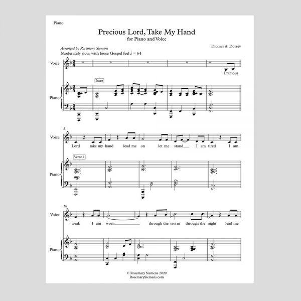 Precious Lord, take My Hand digital sheet music by Rosemary Siemens. The downloadable/printable PDF contains the complete score (piano and voice).